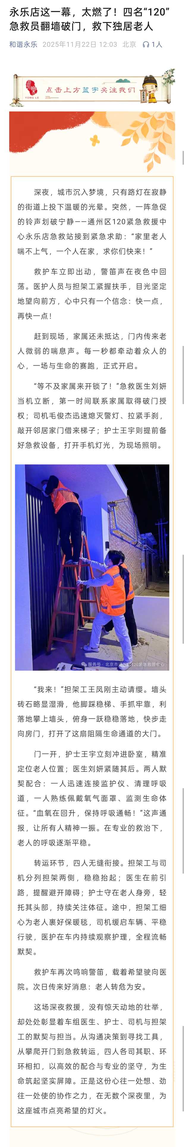 急救员翻墙破门,救下独居老人